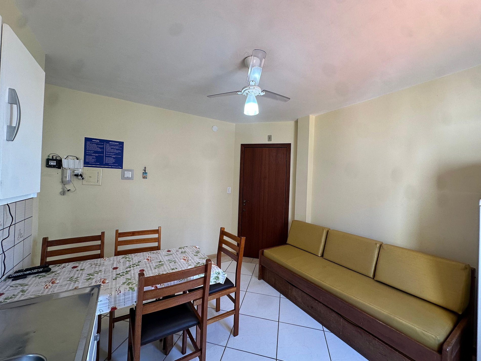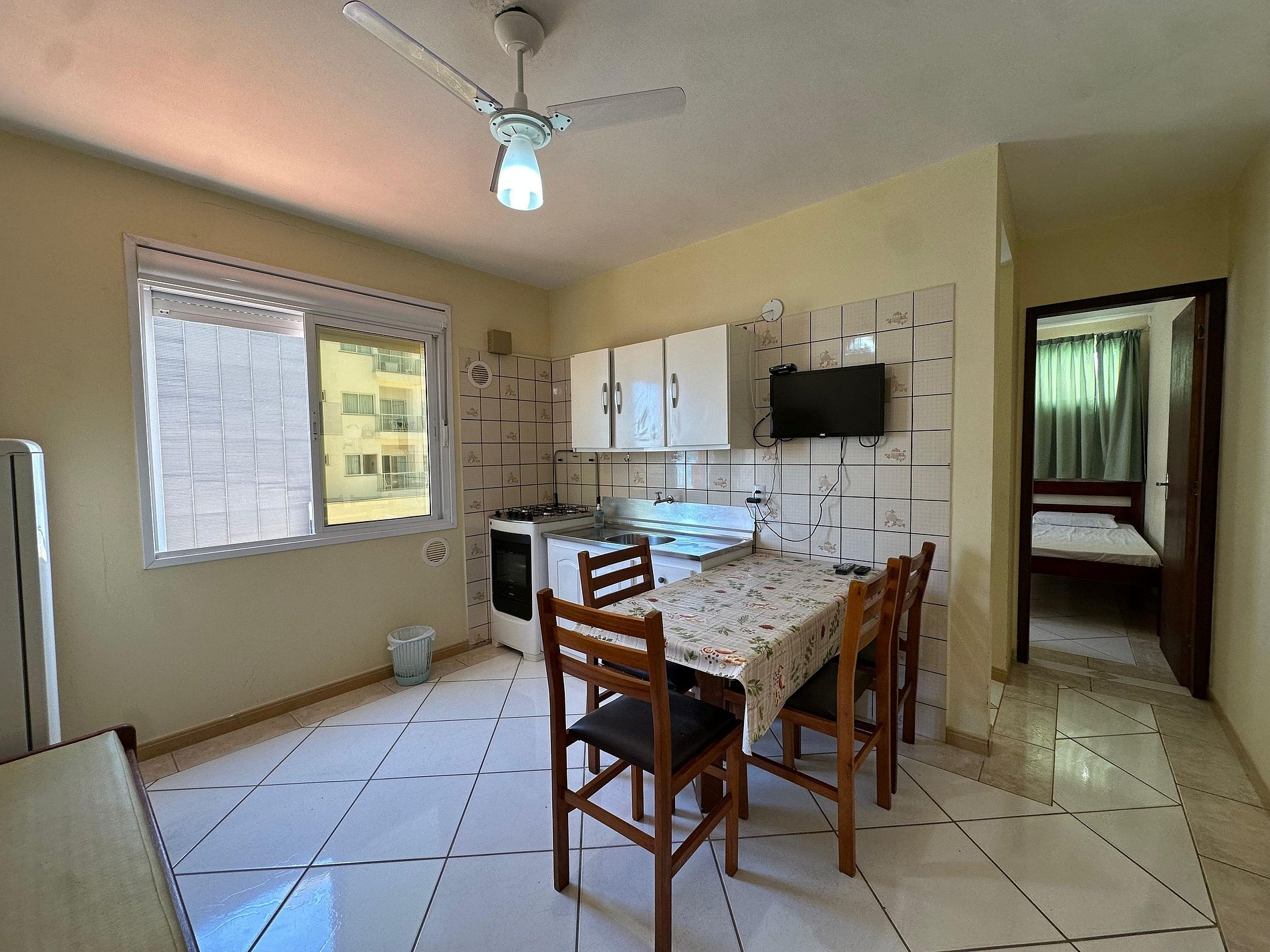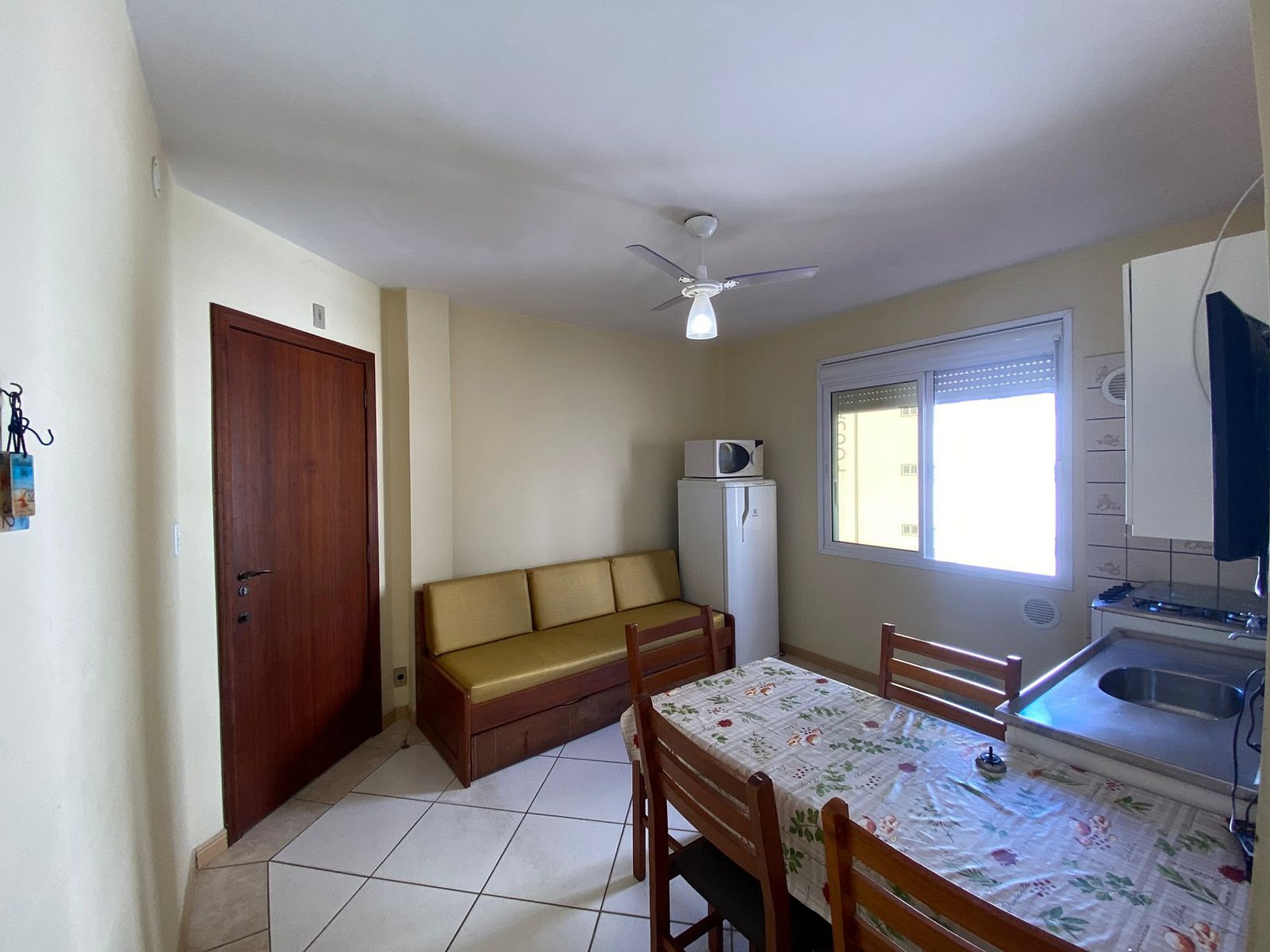 Sala e cozinha integrados, com sofá cama e TV 32 polegadas;