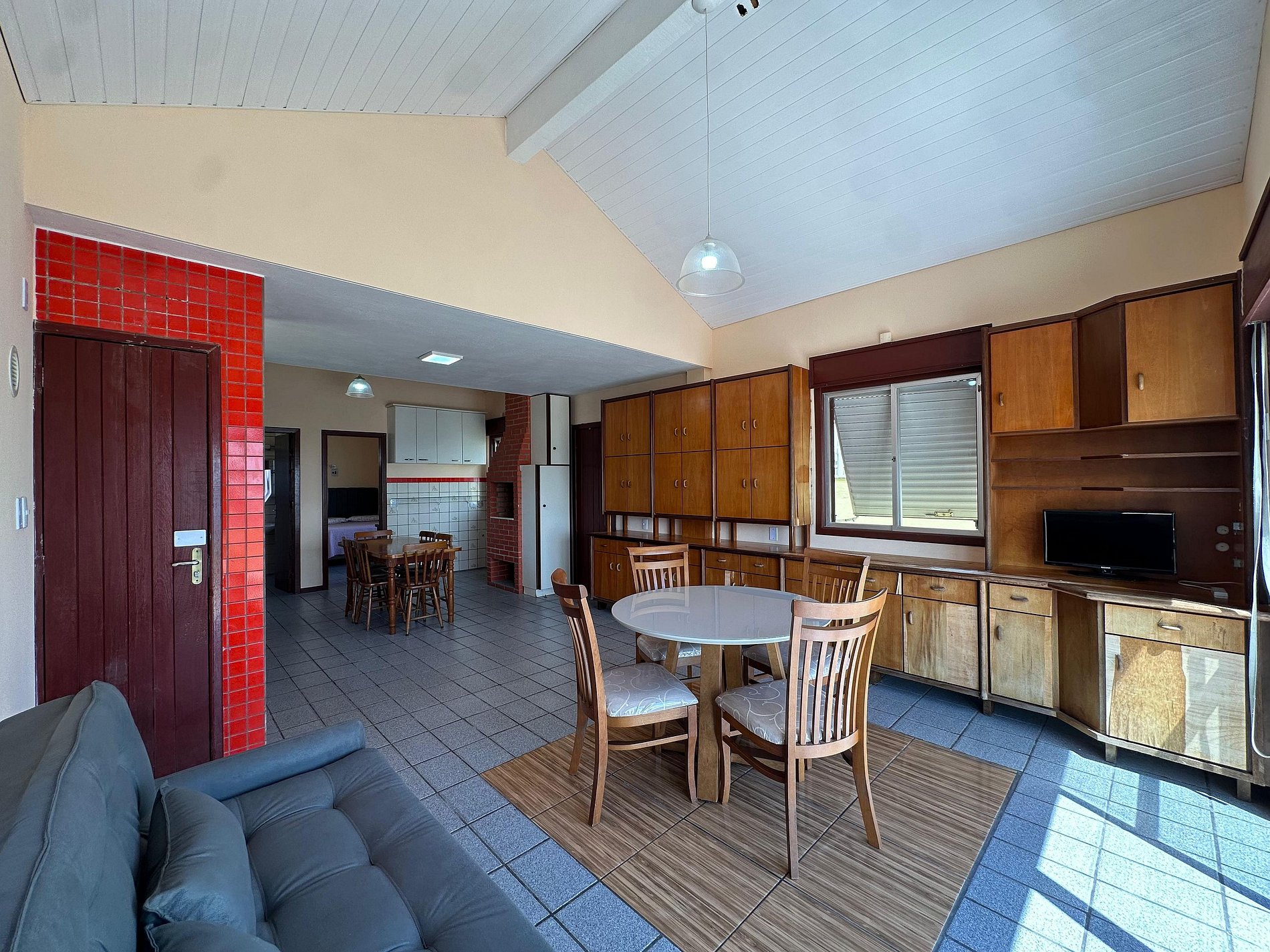 Sala e cozinha integrados, com sofá cama e TV 32 polegadas;