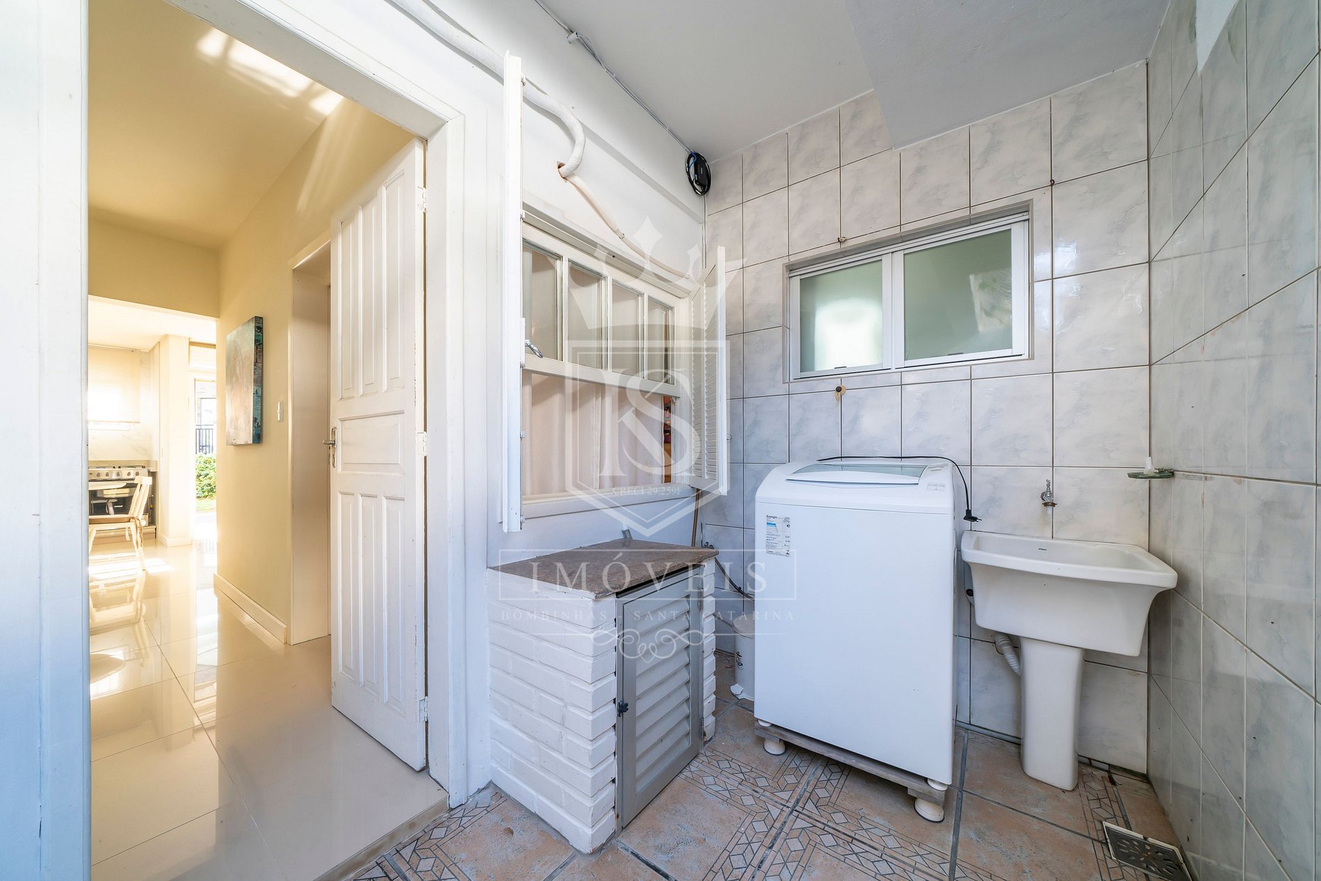Área de serviço com máquina de lavar roupas;