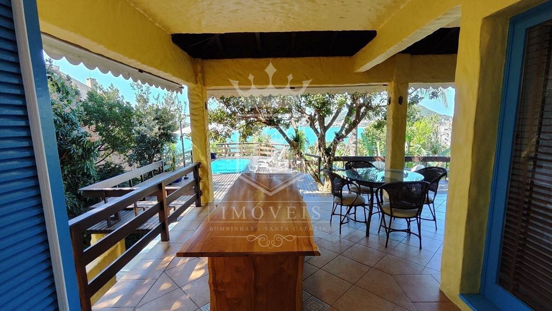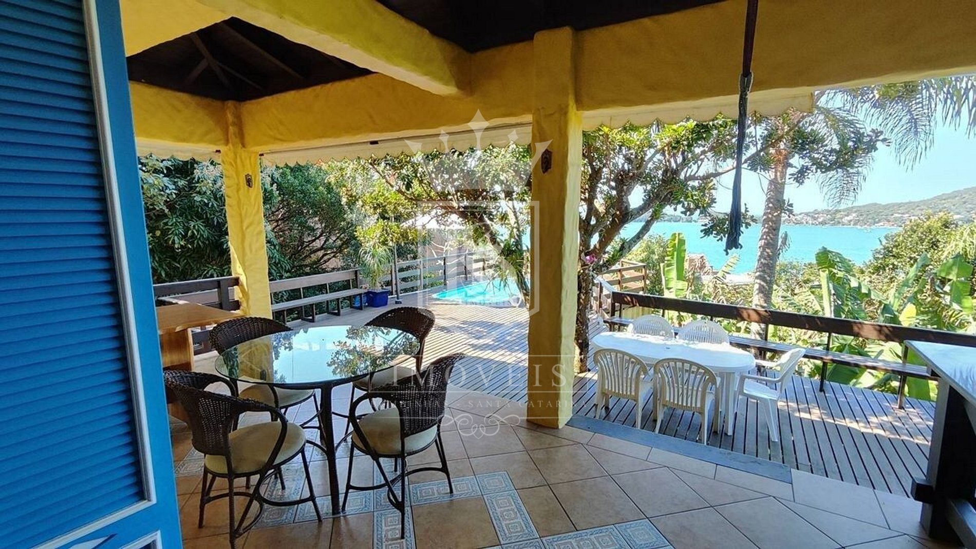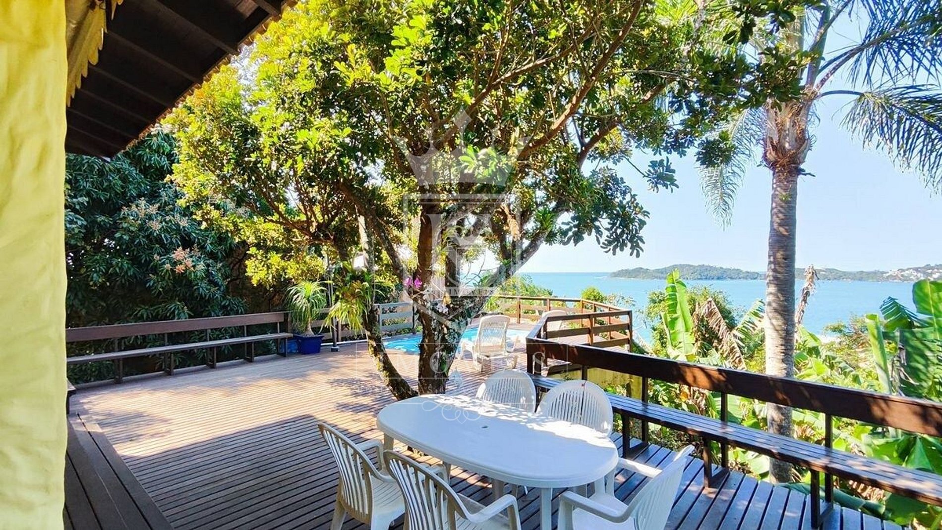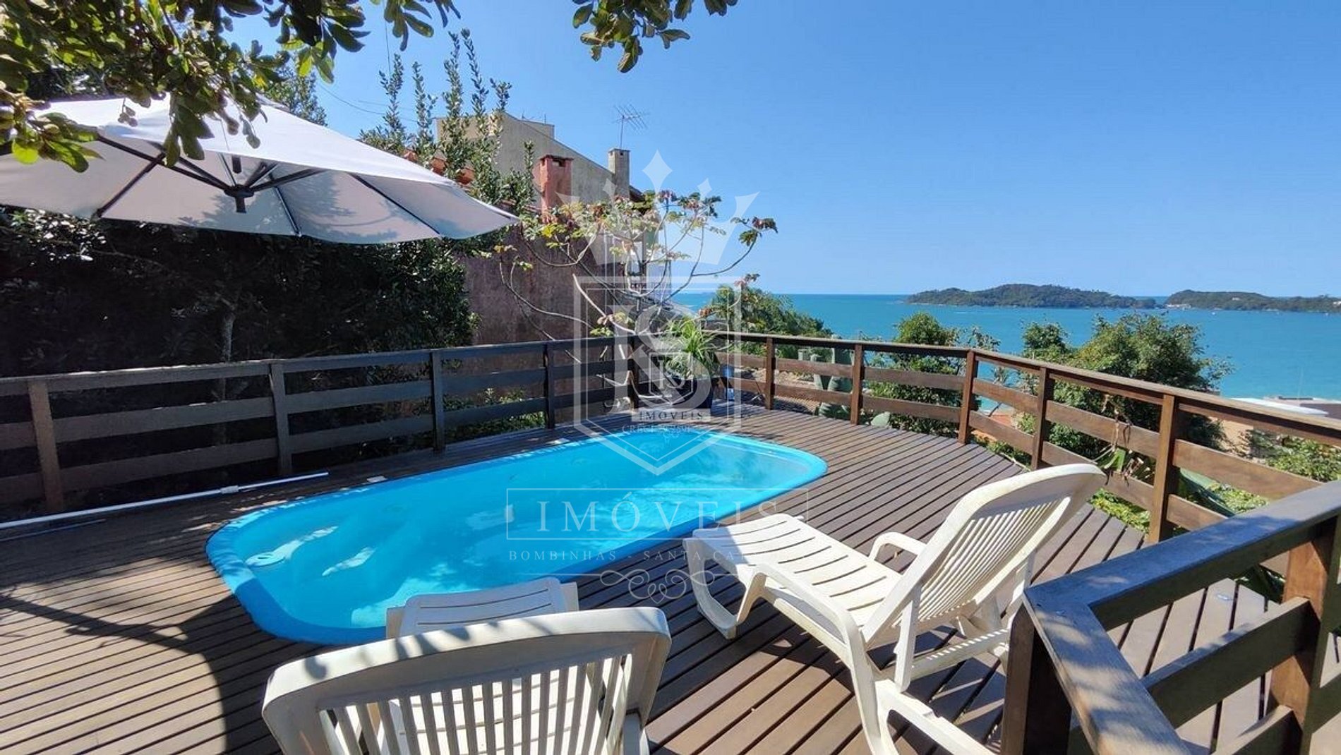 Um lindo deck com piscina e vista panorâmica para a praia de Bombinhas;