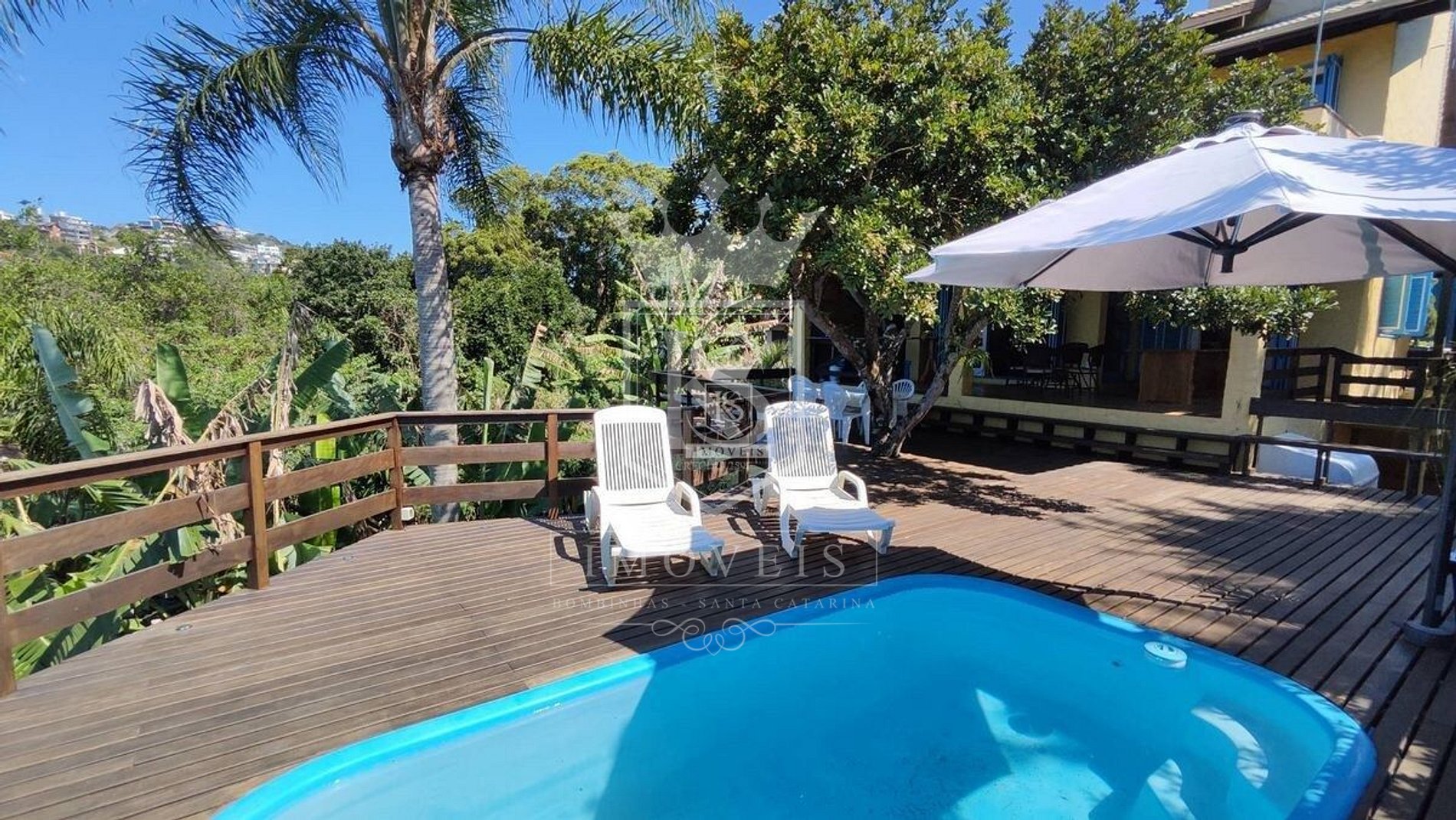 Um lindo deck com piscina e vista panorâmica para a praia de Bombinhas;