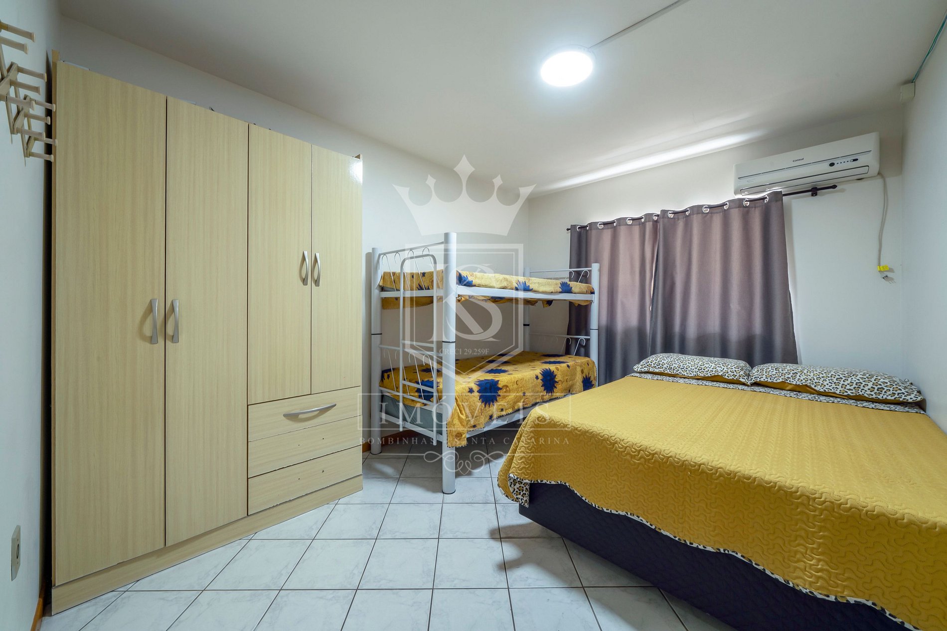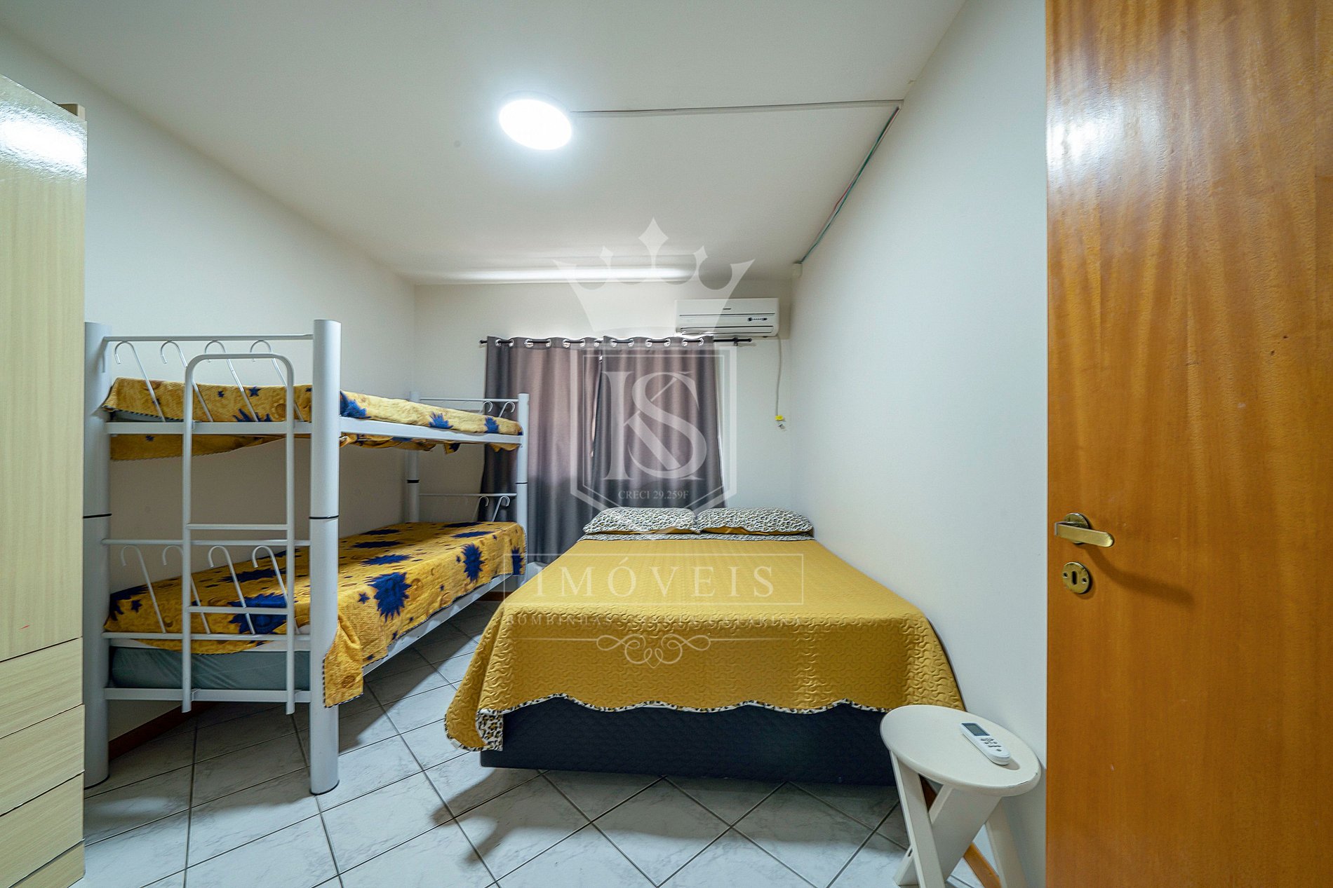 01 dormitório com uma cama de casal e uma beliche de solteiro com ar condicionado;