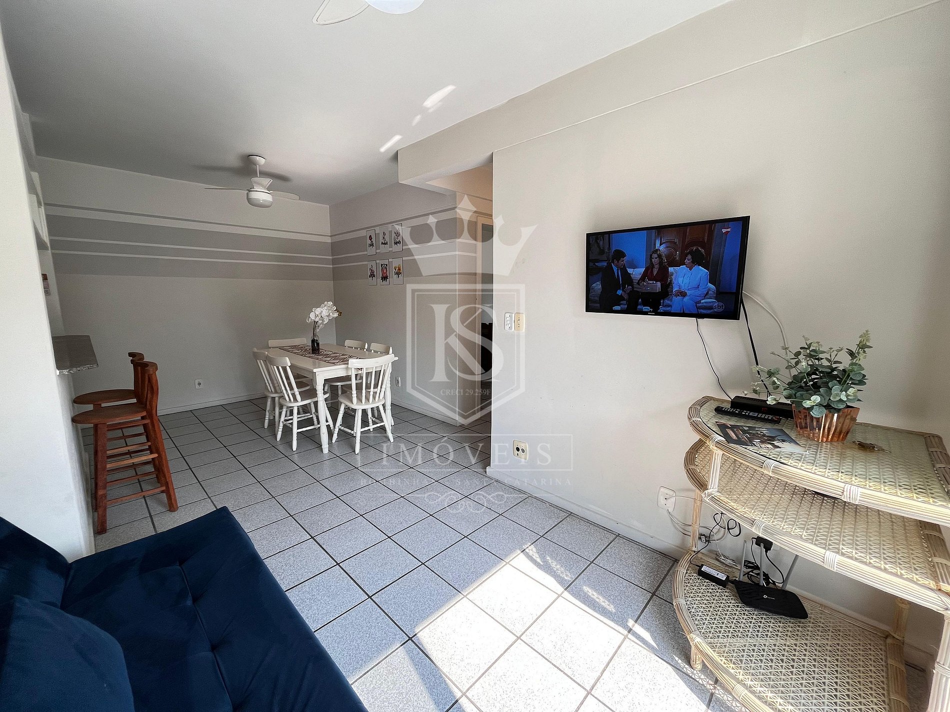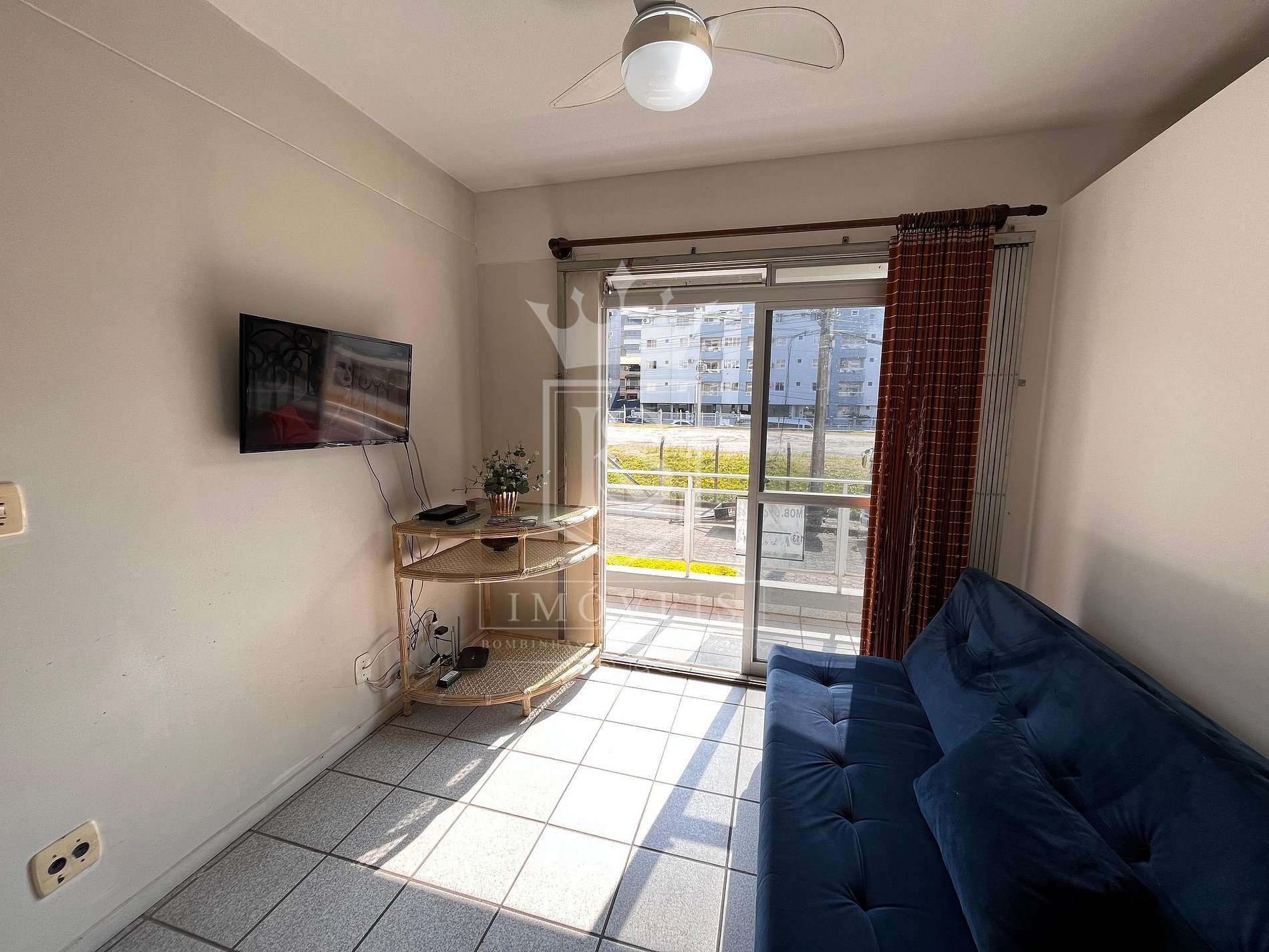 Sala de estar com sofá cama e TV;