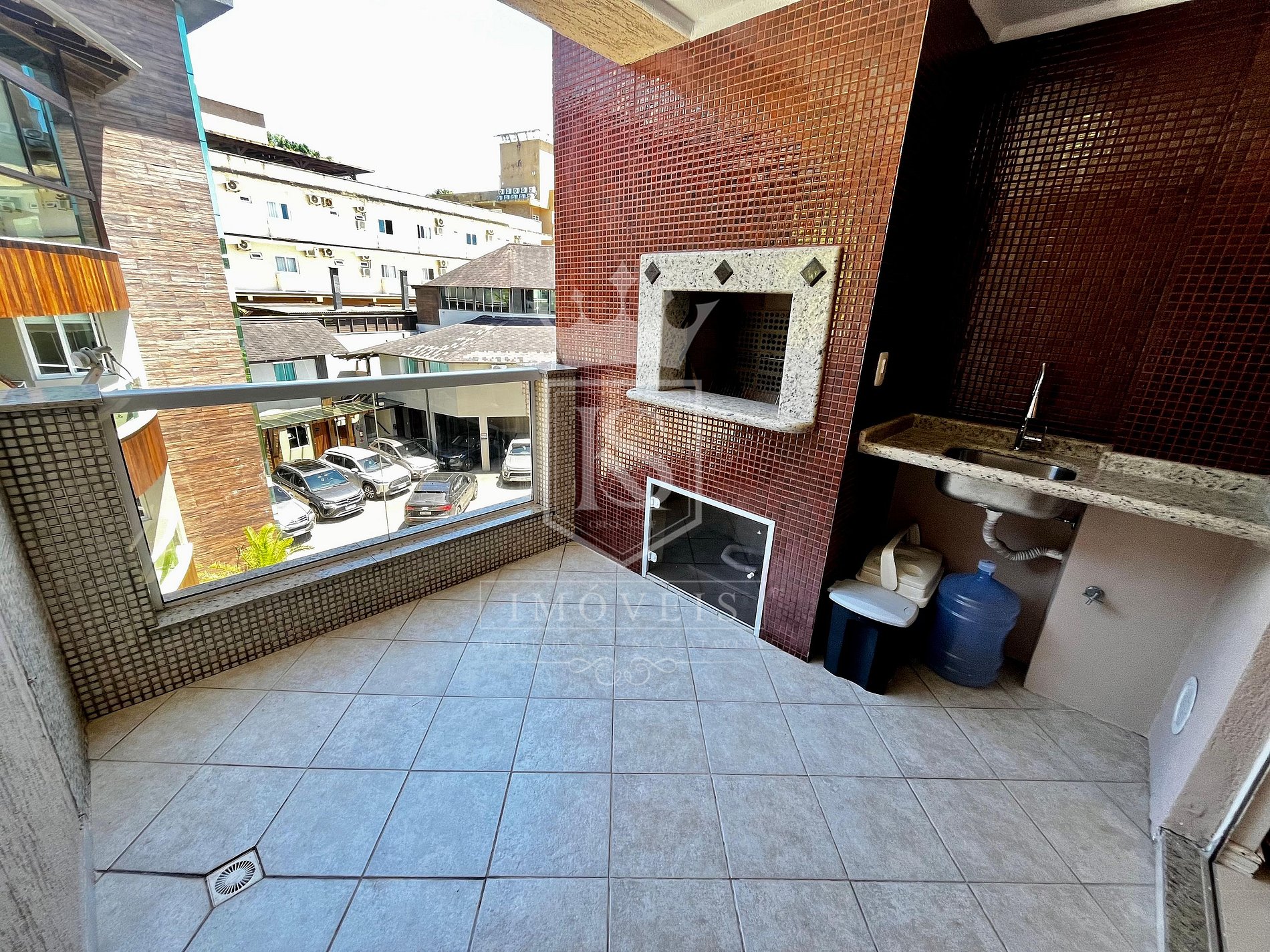 Sacada com churrasqueira e piscina privativa;